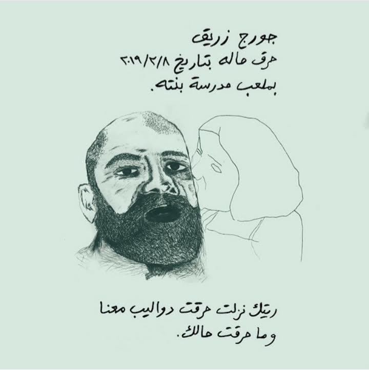 Leaving this ethical questioning to forthcoming historians, it became obvious that the event we witnessed had more to do with Mohamed Bouazizi, a Tunisian street vendor whose self-immolation in Sidi Bouzid, on 17 December 2010, was the catalyst of the Tunisian Revolution and what became known as the Arab Spring. And even more with George Zuraik, who earlier in 2019 set himself in fire because he couldn’t afford anymore his daughter’s tuition fees. Zuraik’s death can retrospectively be seen as one of the prequel events of the revolution that started on 17 October 2019. Among the first pieces produced during the uprising is a drawing by the collective Bel.Mersad, depicting Zuraik and his daughter, with the following inscription (in Arabic): “George Zuraik burned himself on the date of 8/2/2019 in the playground of his daughter’s school. We wish you would have come with us burn tires and not burned yourself”.